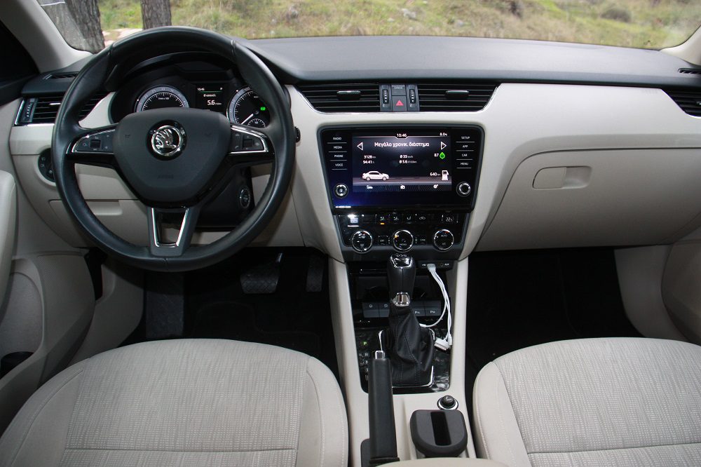 Στο Skoda Octavia 1.6 TDI DSG της δόκιμης τα πλαστικά και τα καθίσματα είχαν ένα μπεζ-λευκό χρώμα που δημιουργούν στο μάτι μια ακόμη πιο ευρύχωρη εικόνα, ενώ τα πλαστικά στο επάνω μέρος του ταμπλό είναι αφρώδη και το μόνο που προδίδει την προσπάθεια συγκράτησης του κόστους είναι τα πλαστικά στο ντουλάπι και το κάτω μέρος των θυρών που είναι σκληρά και ειδικά στο λευκό χρώμα δεν αποπνέουν ποιότητα.
