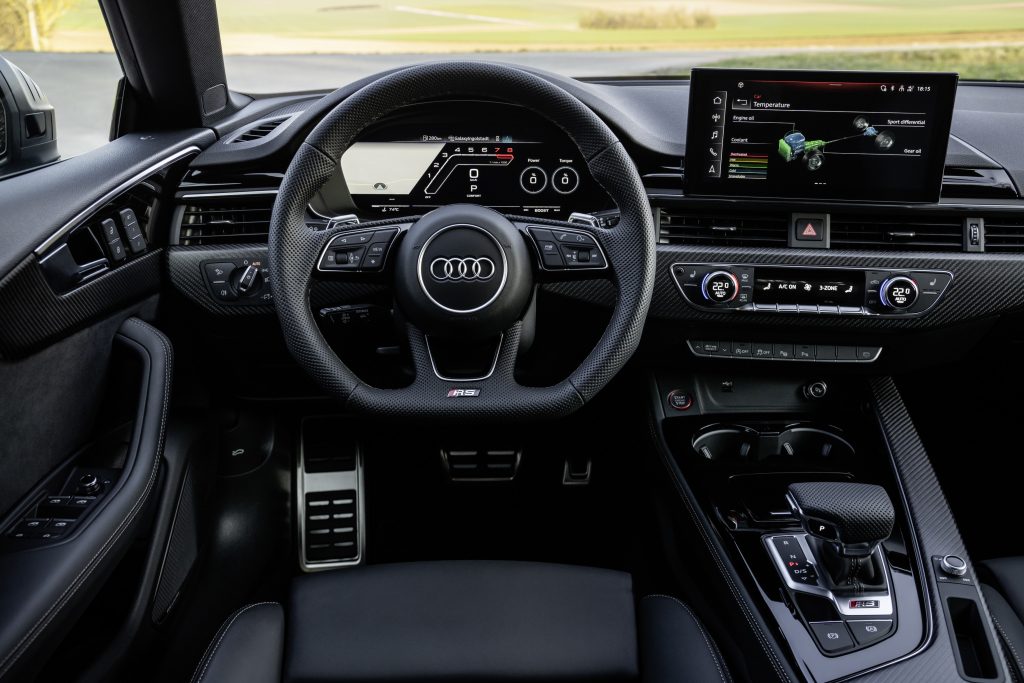 Επιπλέον, εμφανίζονται η επιτάχυνση και οι χρόνοι γύρου σε πίστα. Το πεπλατυσμένο δερμάτινο τιμόνι RS, πλήρως διάτρητο, με νέα paddles αλουμινίου, διαθέτει επίσης το κουμπί “RS MODE”, που χρησιμοποιεί ο οδηγός για να επιλέξει mode λειτουργίας “RS1” ή “RS2” και το οποίο ανοίγει αυτόματα τις ειδικές οθόνες RS στο Audi virtual cockpit. Διαθέσιμο προαιρετικά και head-up display, για την εμφάνιση πολλών λειτουργιών στο παρμπρίζ του αυτοκινήτου.
