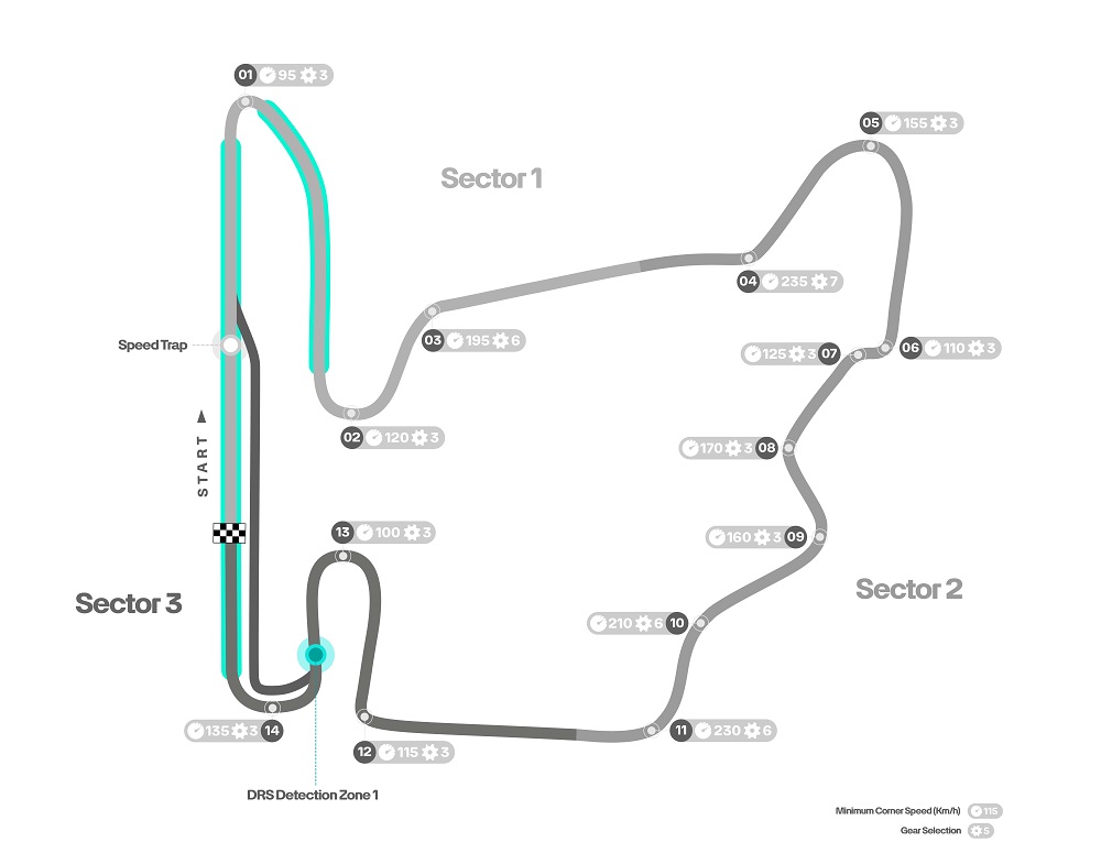 Οι ομάδες θα έχουν στη διάθεσή τους τις μαλακές γόμες της γκάμας C3, C4 και C5. Η πίστα διαθέτει δύο ζώνες DRS: μία στην κύρια ευθεία και μία δεύτερη, συντομότερη, από τη στροφή 1 προς τη στροφή 2, με μόνο μία ζώνη ανίχνευσης πριν την είσοδο στη στροφή 14.