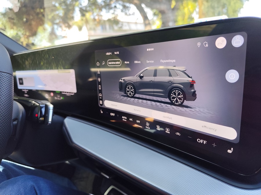 Στο επίπεδο λειτουργίας, ο οδηγός επιλέγει EV (αμιγώς ηλεκτρική κίνηση), Hybrid Auto (έξυπνη συνεργασία TFSI/EM ανάλογα με τη ζήτηση) ή Battery Hold (διατήρηση φόρτισης για αργότερα – π.χ. είσοδο σε αστικό δακτύλιο).